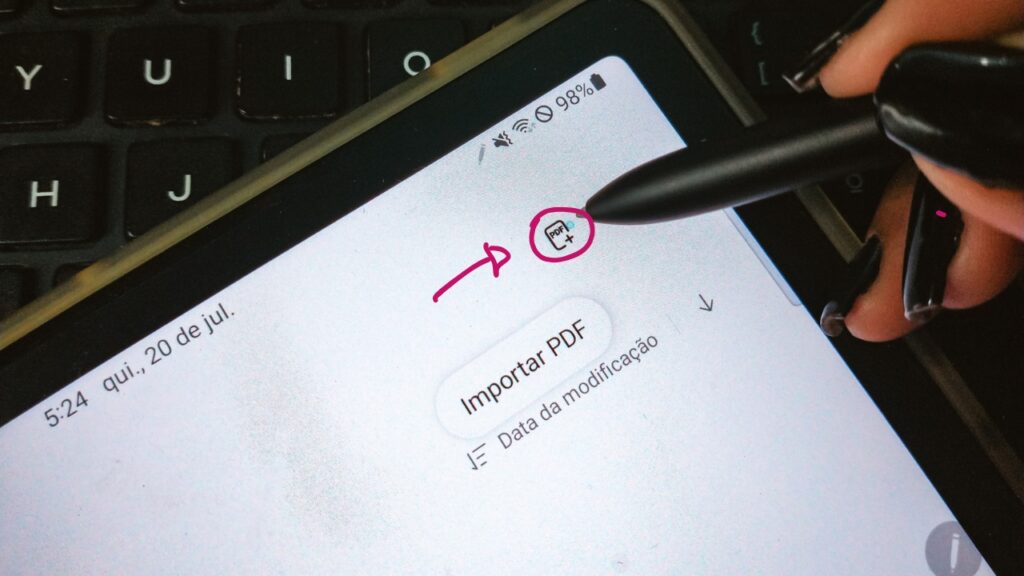 Você vai procurar aí a opção “novo” ou “importar pdf” ou “adicionar”. Procure algo que remeta a criação e/ou importação de um novo arquivo ou nota ou caderno. A nomenclatura vai depender do app que estiver utilizando.
